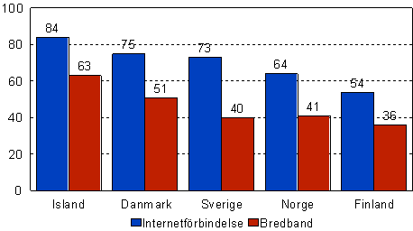På Island hade över 80 procent av hushållen en Internetförbindelse i hemmet, i Finland drygt hälften. Bredband fanns det redan i nästan två hushåll av tre på Island och i omkring hälften av hushållen i Danmark, men i Finland bara i drygt en tredjedel.