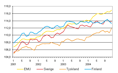 Det harmoniserade konsumentprisindexet 1996 = 100 i Finland, Sverige, Tyskland och EMU