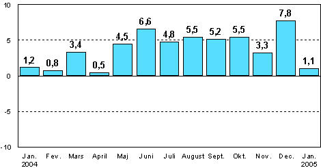 Enligt Statistikcentralen var den säsongrensade industriproduktionen i januari år 2005 1,1 procent större än i januari år 2004. Perioden med en snabb tillväxt, som började i maj i fjol, dämpades klart i januari.