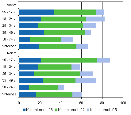 Internetin käyttö on muuttunut säännöllisemmäksi, ja yhä useampi käyttää Internetiä kotona päivittäin. Erityisesti alle 35-vuotiaiden naisten koti-Internetin käyttö on lisääntynyt kolmen viime vuoden aikana: heistä lähes jokainen käyttää Internetiä kotona ainakin viikottain. Laajakaistaliittymän käyttöönotto lisää selvästi kotitalouksien Internetin käyttöä. Marraskuussa 2005 jo neljä viidestä Internet-liittymästä oli laajakaistaliittymä.