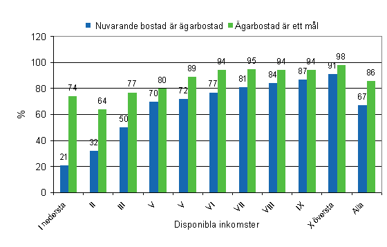 Av de finländska hushållen bodde 67 procent i ägarbostad år 2005. En ägarbostad är dock ett mål för 86 procent av finländarna, en hyresbostad bara för var tionde. Av höginkomsttagarna ville drygt 90 procent bo, och bodde också, i en ägarbostad. Av låginkomstagarna hade drygt 70 procent velat bo i en ägarbostad, men bara en femtedel hade uppnått sitt mål. Ägarboende gynnas, eftersom man anser att ägarbostaden är en bra placering och att den är ekonomiskt fördelaktig. Uppgifterna framgår av Statistikcentralens rapport Suomalaisten asumistavoitteet ja mahdollisuudet(ung. Finländarnas boendemål och möjligheter), som baserar sig på en omfattande intervjuundersökning.