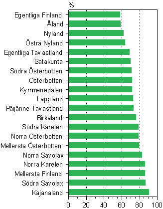 Skogsandelen är störst i Kajanaland, över 90 procent. När det gäller de övriga landskapen är skogsandelen mindre än 60 procent bara i Egentliga Finland och på Åland. De mest skogiga kommunerna i Finland är Suomussalmi och Heinävesi, där skogsandelen är mer än 93 procent.