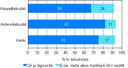 Digisovittimen tai digitelevision oli elokuun puoliväliin mennessä hankkinut 76 prosenttia Suomen 2,3 miljoonasta television omistavasta kotitaloudesta. Toukokuussa digisovitin tai digitelevisio oli 69 prosentilla televisiotalouksista. Antennin välityksellä televisiota katsovista talouksista 82 prosenttia omisti digisovittimen. 18 prosentilta eli yli 220 000 antennitaloudelta puuttui siis elokuussa yhä digisovitin, vaikka Suomi siirtyy digiaikaan 1. syyskuuta. Tiedot perustuvat Tilastokeskuksen kuluttajabarometrin yhteydessä neljästi vuodessa tehtävään laitetiedusteluun, johon osallistui 1.-17. elokuuta 1 535 kotitaloutta.