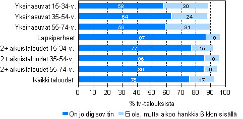 Lapsiperheistä ja kahden tai useamman vähintään keski-ikäisen aikuisen tv-talouksista jo yli 85 prosenttia oli elokuussa siirtynyt digiaikaan. Ostoaikomusten perusteella noin 5 prosentilta usean hengen talouksista näyttäisi puuttuvan digisovitin vielä ensi vuoden alussa.