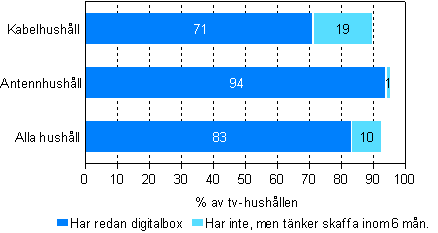 Av antennhushållen hade 94 procent en digitalbox i november. Av kabelhushållen hade bara 71 procent en digitalbox. Uppgifterna grundar sig på den enkät om apparater som görs fyra gånger om året i samband med Statistikcentralens konsumentbarometer. I enkäten deltog 1-19 november 1 447 hushåll.