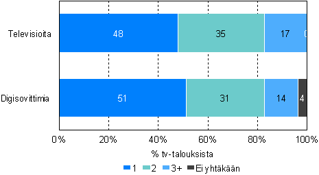Toukokuussa 52 prosentilla tv-talouksista oli vähintään kaksi televisiota ja 45 prosentilla tv-talouksista oli enemmän kuin yksi digisovitin. Jokaiselle televisiolle tarvitaan oma erillinen digisovittimensa. Helmikuussa monen sovittimen talouksia oli 40 prosenttia. Tallentavan eli kiintolevyllisen digisovittimen oli toukokuussa hankkinut 38 prosenttia tv-talouksista.