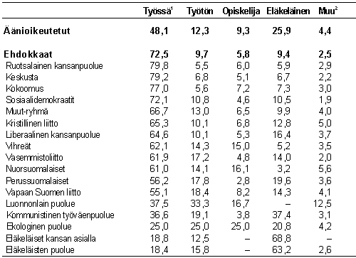 Tilastokeskus analysoi puolueiden väestöryhmittäisen kannatuksen muutosta äänestysalueittaisilla profiileilla. Analyysi perustui tietoihin 1 500 äänestysalueesta, ei yksittäisten ihmisten äänestämisestä.