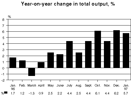 Output in agriculture and forestry grew by 4.5 per cent in the year to January. Output in manufacturing was up by 7.5 per cent on the year before as calculated per working day. Output in the construction industry increased by 13.5 per cent and that in the wholesale and retail trade by 3.5 per cent. Output in transport and communications was up by over 10 per cent and that in other services as well as in government services by 2.5 per cent.