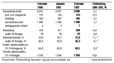 Antalet arbetsplatser ökade från februari i fjol med omkring 20 000 inom både förädling och servicesektorn framgår det av Statistikcentralens reviderade arbetskraftsundersökning. Totalt var 2 094 000 personer sysselsatta i februari, vilket var drygt 40 000 fler än för ett år sedan.