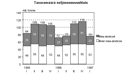 Viime vuoden puolivälissä alkanut kuorma-autokuljetusten kasvu jatkui vuoden 1997 ensimmäisellä neljänneksellä. Kuorma-autoilla kuljetettiin tammi-maaliskuussa tavaraa yhteensä 75 miljoonaa tonnia, joten kasvua edellisen vuoden vastaavaan ajanjaksoon verrattuna kertyi lähes 5 prosenttia. Muita tavaroita kuin maa-aineksia kuljetettiin 53 miljoonaa tonnia, eli noin 8 prosenttia enemmän kuin edellisen vuoden tammi-maaliskuussa. Tiedot ilmenevät Tilastokeskuksen laatimasta tieliikenteen tavarankuljetustilastosta.