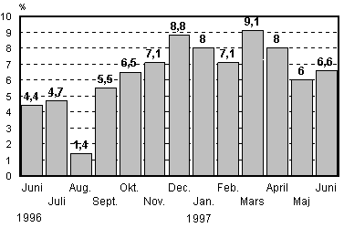 Pappersproduktionen ökade i juni med mer än 20 procent. Produktionen inom den byggnadsanslutna industrin ökade med närmare 10 procent och metallindustriproduktionen med drygt 8 procent från juni 1996. Av de huvudsakliga näringsgrenarna inom metallindustrin ökade tillverkningen av eltekniska produkter med 17 procent, produktionen av metallvaror med omkring 11, produktionen inom basmetallindustrin med drygt 8 och tillverkningen av maskiner med en knapp procent. Produktionen inom den kemiska industrin ökade med drygt 4 procent och produktionen inom den övriga tillverkningsindustrin med 1,5 procent. Elproduktionen minskade med drygt 6 procent.