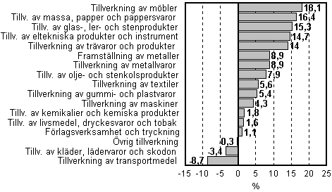 Under januari-juni var industriproduktionen 7,5 procent större än under motsvarande period året innan. Tillverkningen av möbler ökade mest, med mer än 18 procent, och den kemiska skogsindustrin, med drygt 16 procent jämfört med året förut. Tillverkningen av eltekniska produkter fortsatte med en livlig ökning på närmare 15 procent. Tillverkningen av glas-, ler- och stenprodukter ökade också med omkring 15 procent och trävarutillverkningen med 14 procent.