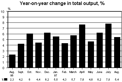 Total output was up by 5.4 per cent in the year to August as indicated by the Monthly Indicator of Total Output calculated by Statistics Finland. Growth slowed down from July, when output grew by 7.8 per cent on the year before. However, the fast growth rate in July was partly due to the differences in the timing of holidays and shut-downs for repairs in manufacturing this year and last year.