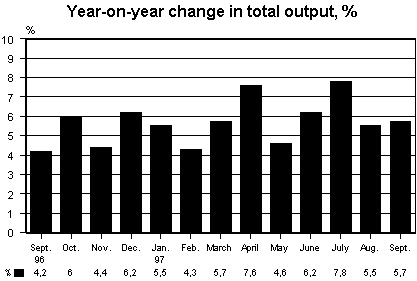 Output in construction was still brisk, seeing a rise of 16.5 per cent compared to September 1996. Fuelled by commercial fellings, output in agriculture and forestry increased by 16.2 per cent, while output in trade and commerce rose by 9.2 per cent and transportation by 8.7 per cent. Output in manufacturing as calculated per working day grew by 4.3 per cent in the year to September. Other services and government services were up by 1.5 per cent.