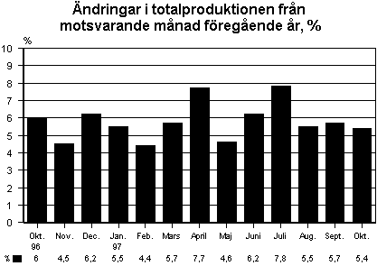 Den totala produktionsvolymen ökade med 5,4 procent från oktober i fjol till oktober i år. Enligt Statistikcentralens månadsgraf över totalproduktionen ökade produktionen inom alla huvudnäringsgrenar. Förutom av exporten upprätthölls ökningen fortfarande av den inhemska efterfrågan. Detta märktes i form av en snabb produktionsökning inom byggandet, handeln och samfärdseln.