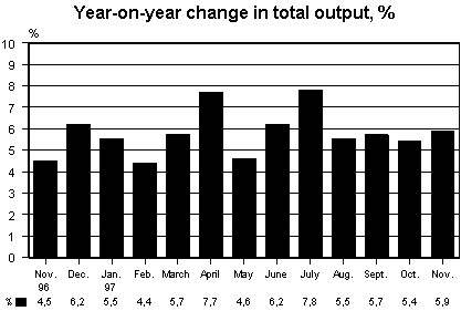 Total output increased by 5.9 per cent in the year to November 1997. The Monthly Indicator of Total Output of Statistics Finland shows that output went up in all main sections of industry. Apart from being sustained by a strong increase in manufacturing output, growth also continued to be supported by increases in output in agriculture and forestry, construction, and transportation.