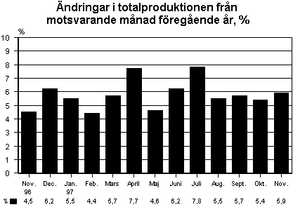 Från november 1996 till november 1997 ökade totalproduktionen med 5,9 procent. Enligt Statistikcentralens månadsgraf över totalproduktionen ökade produktionen inom alla näringsgrenar. Utöver den kraftiga ökningen av industriproduktionen upprätthölls tillväxten fortfarande av produktionsökningen inom jord- och skogsbruk, byggverksamhet och samfärdsel.