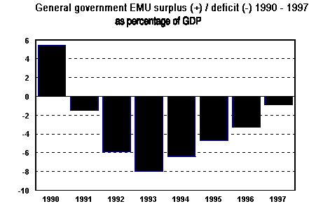 General government deficit, used as one of the EMU convergence criteria, was FIM 6 billion last year. According to preliminary data, Finland's EMU deficit amounted to 0.9 per cent of GDP last year. The total gross debt of general government, or EMU debt, amounted to 55.8 per cent of GDP. The proportion of the financial deficit of GDP decreased for the fourth, and the debt ratio for the third year running. The statistics have been produced in accordance with the EU Commission's regulations concerning statistics on EMU debt and deficit, therefore the data do not agree with National Accounts data on financial deficit.