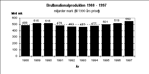 Volymen av bruttonationalprodukten ökade enligt Statistikcentralens preliminära uppgifter med 5,9 procent i fjol. Så snabb har tillväxten tidigare varit åren 1979 (7,0 procent) och 1989 (5,7 procent). Totalproduktionen har således tydligt överskridit nivån under toppåren 1989 och 1990. Den nominella bruttonationalprodukten var i fjol 618 miljarder mark.
