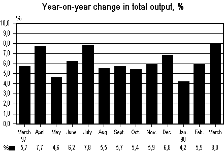 Total output increased by 8 per cent in the year to March. The Monthly Indicator of Total Output of Statistics Finland shows that output grew briskly in all main sections of industry.