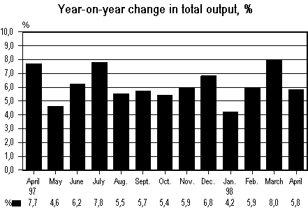 Output in manufacturing as calculated per working day grew by 10.5 per cent in the year to April. Output went up by 5.6 per cent in construction and by 5.5 per cent in trade. Output in transport increased by 2.5 per cent. Other services and government services went up by 1.7 per cent. Output in agriculture and forestry went down by 1.7 per cent on the previous year.