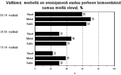 Ikäryhmien välillä on selviä eroja suhtautumisessa naisten ja miesten velvollisuuksiin. Iäkkäät ja nuoret suhtautuivat eri tavoin väittämään 'miehellä on ensisijaisesti vastuu perheen toimeentulosta'. Iäkkäiden enemmistö on samaa mieltä, nuorten enemmistö eri mieltä. Jos nuorten mielipiteet pysyvät ennallaan, naisten vastuu perheen elatuksesta näyttää kasvavan tulevaisuudessa.
