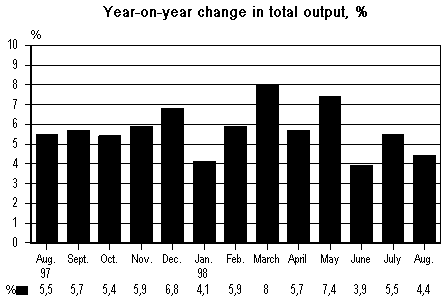 In the year to August, output in construction went up by 9 per cent, in trade by 7.6 per cent, in transportation by 5.4 per cent and output in all manufacturing as calculated per working day grew by 5.3 per cent. Other services and government services increased by 1.7 per cent. Output in agriculture and forestry fell by 2.4 per cent because of the poor grain crop.
