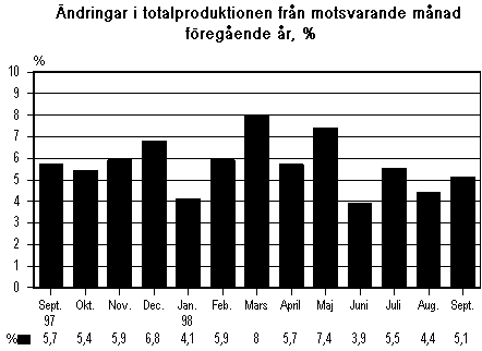 Totalproduktionen ökade med 5,1 procent från september i fjol till september i år. Produktionen var något snabbare än i augusti, då ökningen var 4,4 procent. Enligt Statistikcentralens månadsgraf över totalproduktionen ökade produktionen inom alla huvudsakliga näringsgrenar med undantag av jord- och skogsbruk.