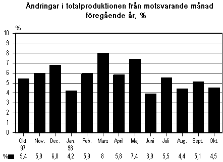 Totalproduktionen ökade med 4,5 procent från oktober i fjol till oktober i år. Produktionsökningen var något långsammare än i september, då den var 5,1 procent. Enligt Statistikcentralens månadsgraf över totalproduktionen ökade produktionen inom alla huvudsakliga näringsgrenar med undantag av jord- och skogsbruk.