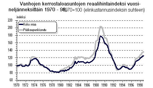 Vuoden 1998 viimeisellä neljänneksellä vanhat kerrostaloasunnot maksoivat pääkaupunkiseudulla keskimäärin 11,9 prosenttia ja muualla maassa keskimäärin 8,2 prosenttia enemmän kuin vuotta aikaisemmin.