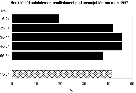 Palkansaajat saivat henkilöstökoulutusta keskimäärin 5 päivää vuonna 1997. Vähiten koulutuspäiviä oli kaikkein nuorimmilla ja vanhimmilla: 15 - 24-vuotiailla keskimäärin 3 päivää ja 55 - 64-vuotiailla 4 päivää.