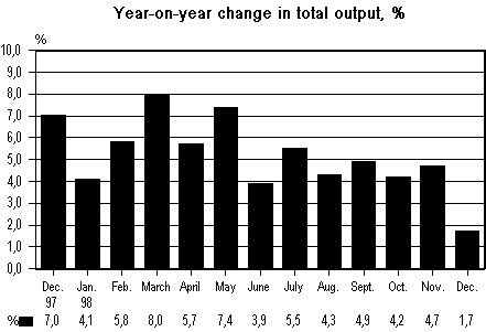 Total output increased by 1.7 per cent in the year to December 1998. Growth slowed down clearly from November, when output grew at the rate of 4.7 per cent. The Monthly Indicator of Total Output of Statistics Finland shows that output went up in all main branches of industry.