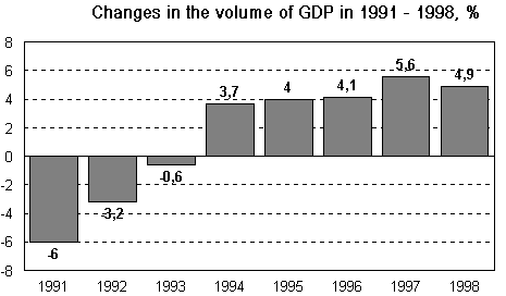 According to preliminary data, the volume of total output in 1998 was 24.5 per cent greater than it was at the deepest point of the recession in 1993. Last year's nominal GDP was FIM 676 billion.