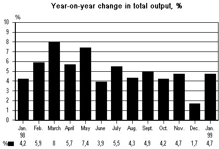 In manufacturing, output was further sustained by the manufacture of electrical equipment, which increased by almost 50 per cent from January 1998. Total economic growth was supported by an increase in the output of construction, trade and transport.