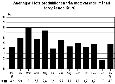 Totalproduktionen ökade med 4,7 procent från januari i fjol till januari 1999. Tillväxten blev tydligt snabbare från december i fjol, då produktionsökningen var 1,7 procent. Enligt Statistikcentralens månadsgraf över totalproduktionen ökade produktionen inom alla huvudsakliga näringsgrenar med undantag av jord- och skogsbruk.