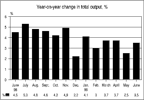 Output in construction grew by 6.5 per cent and in trade by 5.8 per cent from June 1998 to June 1999. Output in transport went up by 2.7 per cent. In other services and government services, output increased by 1.6 per cent.