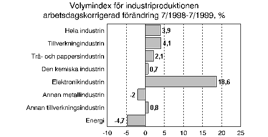 Finlands industriproduktion ökade med 3,2 procent (säsongutjämnad), vilket internationellt sett är en mycket snabb tillväxt. I USA ökade produktionen från juli i fjol till juli i år med 3,6 procent och i Japan med 0,1 procent. I Tyskland var industriproduktionen däremot 1,7 procent och i England 0,7 procent mindre än i juli 1998. (Källa: OECD, säsongutjämnade serier).
