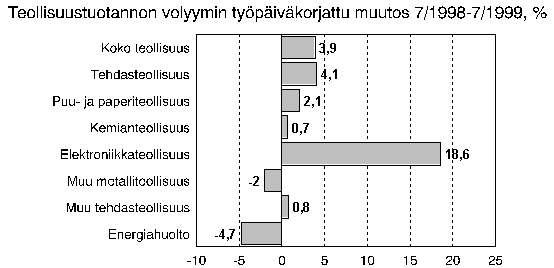 Suomen teollisuustuotannon 3,2 prosentin kasvu heinäkuussa (kausitasoitettu) oli kansainvälisesti verrattuna nopeaa. Heinäkuun tuotanto oli Yhdysvalloissa 3,6 prosenttia ja Japanissa 0,1 prosenttia edellisvuotista suurempi. Sen sijaan Saksassa teollisuustuotanto jäi 1,7 prosenttia ja Englannissa 0,7 prosenttia pienemmäksi kuin heinäkuussa 1998. (Lähde: OECD, kausitasoitetut sarjat)