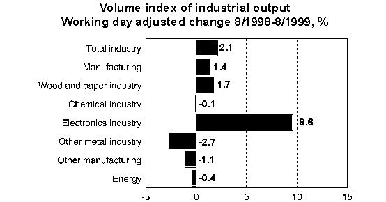 In the January to August period, industrial output was up by 4.9 per cent compared to last year's corresponding period. Output in the metal industry increased by 12.2 per cent, thanks to the electrical industry, where output rose by good 35 per cent. Output in the chemical industry went up by 0.4 per cent. In the wood and paper industry output fell by 0.4 per cent and in other manufacturing by good one per cent compared to the January to August period last year.