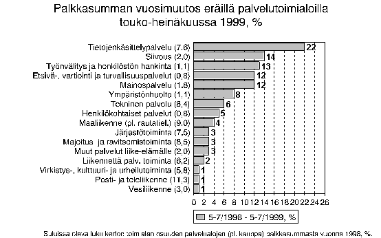 Nopeimmin palkkasumma on kohonnut tietojenkäsittelypalvelussa, missä kasvu touko-heinäkuussa oli 22 prosenttia edellisestä vuodesta. Tietojenkäsittelyalan osuus palvelualojen maksetuista palkoista oli 8 prosenttia vuonna 1998.