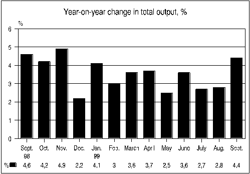 The volume of total output was 4.4 per cent greater this September than in September 1998. The Monthly Indicator of Total Output of Statistics Finland indicates that, except for agriculture and forestry, output went up in all main industries of the national economy.