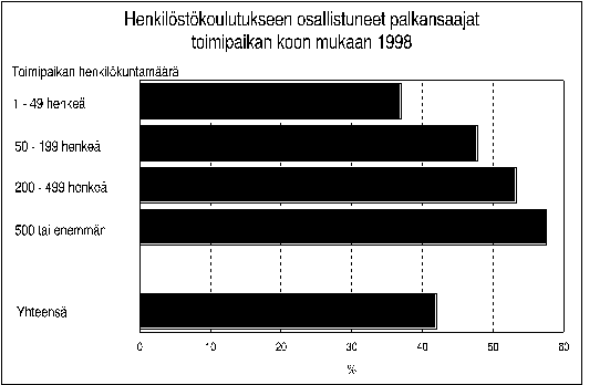Henkilöstökoulutukseen osallistui vuonna 1998 yhteensä 781 000 palkansaajaa eli 42 prosenttia palkansaajista. Osuus oli samansuuruinen kuin vuotta aiemmin. Henkilöstökoulutuksella tarkoitetaan työantajan tukemaa tai kustantamaa koulutusta. Tiedot perustuvat Tilastokeskuksen tekemään EU-työvoimatutkimukseen.