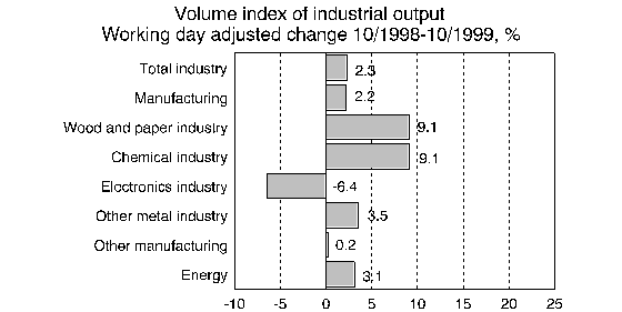 In the January to October period, industrial output was up by 4.6 per cent compared to last year's corresponding period. Output in the metal industry increased by just under 10 per cent. The fastest grower was the electronics industry, where output went up by good 26 per cent. Output in the chemical industry went up by two per cent. In the wood and paper industry, output turned to a two per cent growth. In other manufacturing, output fell by just short of one per cent.