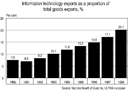 In 1997, the turnover of enterprises in the information sector totalled over FIM 130 billion, and represented 11 per cent of the total turnover of all enterprises. In 1998, the value of the exports of industrial products typical of the information society amounted to over FIM 46 billion, in other words over 20 per cent of all Finnish goods exports. In 1997, communications equipment alone accounted for 7.4 per cent of the total value of Finnish manufacturing output.