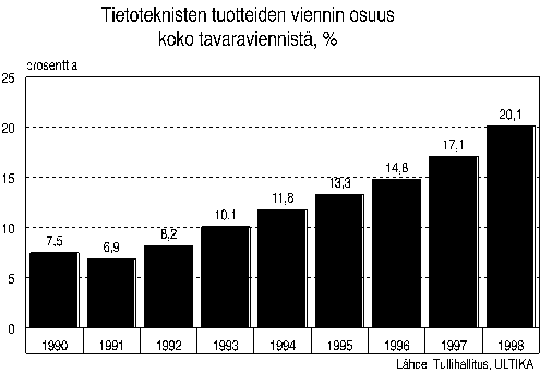 Tietoteknisten tuotteiden osuus koko tavaraviennistä yli 20 prosenttia