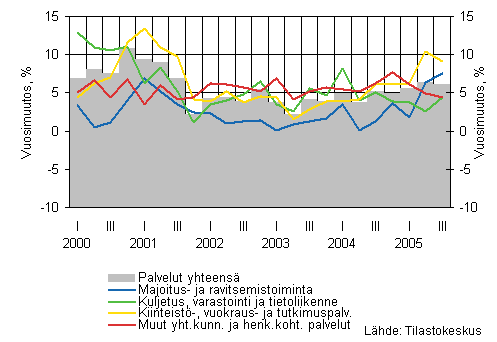 Palvelualojen liikevaihto oli reippaassa kasvussa vuoden 2005 kolmannella neljänneksellä. Liikevaihdon kasvu hidastui hieman edeltävästä neljänneksestä, mutta siitä huolimatta kasvu ylsi 6 prosenttiin. Edeltävää neljännestä lukuun ottamatta palvelualojen liikevaihto on kasvanut yhtä voimakkaasti viimeksi vuonna 2001. Palvelualojen kasvun takana ovat ennen kaikkea pienet (alle 50 henkeä työllistävät) yritykset, jotka ovat tuottaneet melkein 4 prosenttiyksikköä toimialan 6 prosentin kasvusta. Pienten yritysten voimakasta vaikutusta toimialan kasvuun selittää se, että valtaosa (noin 99 prosenttia) toimialan yrityksistä työllistää alle 50 henkeä.