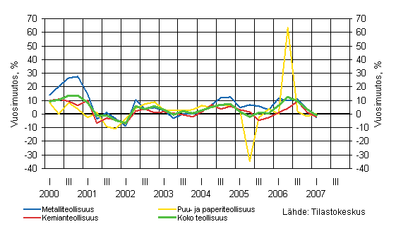Puu- ja paperiteollisuudessa tuotannon määrä väheni ensimmäisellä vuosineljänneksellä aavistuksen, mutta hintojen nousu ylläpiti liikevaihdon kasvua. Kotimaan myynti kasvoi selvästi vientiä enemmän. Kemianteollisuudessa tuotannon määrän pieneneminen ja öljytuotteiden hintojen taittuminen hidastivat myös liikevaihdon kasvua. Metalliteollisuuden tuotanto pieneni ensimmäisellä vuosineljänneksellä vuodentakaisesta, mutta sekä liikevaihto ja että viennin arvo kasvoivat ripeästi osittain perusmetallien kallistumisen ansiosta.