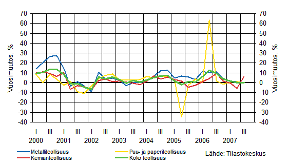 Teollisuuden suhdannetilanne oli vuoden 2007 kolmannella neljänneksellä edelleen hyvä. Teollisuusyritysten sekä kotimaan että vientiliikevaihto kasvoivat koko alkuvuoden, joskin kasvuvauhti hieman hidastui toisella ja kolmannella neljänneksellä ensimmäiseen neljännekseen verrattuna. Tuottajahinnat ja vientihinnat nousivat pari prosenttia vuodentakaisesta ja nousuvauhti hidastui vuoden 2007 alkuun verrattuna. Teollisuuden työllisyys heikkeni vuoden kolmannella neljänneksellä etenkin metsäteollisuudessa.