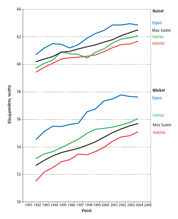 Kuviossa 1 on esitetty 20-vuotiaiden elinajanodotteen kehitys vuodesta 1991 vuoteen 2005 sukupuolen mukaan Helsingissä, Espoossa, Vantaalla ja muussa Suomessa. Elinajanodotteen kehitys on ollut Helsingissä terveyspoliittisten tavoitteiden mukaista, sillä se on kasvanut koko tarkastelujakson. Kasvua vuosista 1991-1993 vuosiin 2003-2005 oli miehillä 3,6 vuotta ja naisilla 2,3 vuotta, mikä miesten osalta oli hieman enemmän kuin pääkaupunkiseudun muissa kaupungeissa ja muualla Suomessa ja naisilla samaa tasoa kuin muualla.