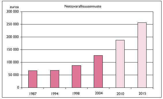 Kuviossa 1 on esitetty laskelma, jossa varallisuuden kehitystä arvioidaan vuoteen 2015 asti. Jos varallisuus kasvaisi yhtä paljon kuin vuosijaksoina 1994-1998 ja 1998-2004 keskimäärin (kerroin, joka laskettu siten, että ensin lasketaan jälkimmäisen ja edellisen ajankohdan erotus, mistä luvusta otetaan niin mones juuri kuin on vuosia), nettovarallisuuden arvo olisi vuonna 2015 kaksinkertainen vuoteen 2004 verrattuna. Tämän suuruinen kasvu edellyttää melko hyvää talouskehitystä ja iso lama olisi paha suonenisku, mikä johtaisi varallisuuden menetyksiin. Varallisuuden määrän kasvua on vaikea ennakoida, koska siihen vaikuttavat monet tekijät muun muassa talouskasvu, väestörakenteen ja -määrän muutokset sekä tulo- ja tuottavuuskehitys.